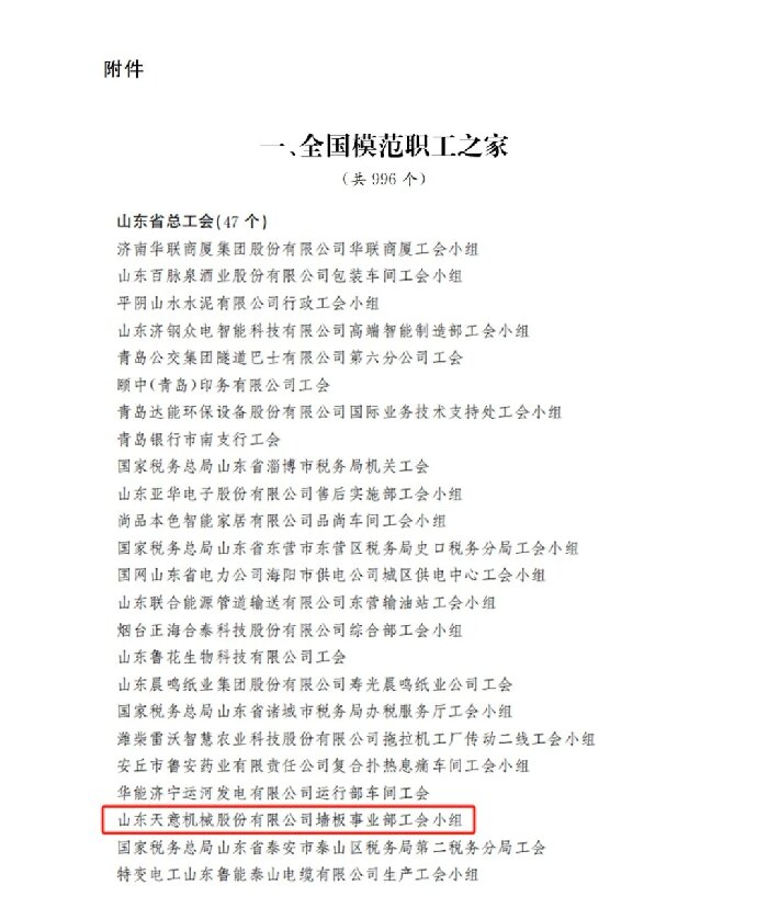 近日,中華全國總工會下發(fā)了《關(guān)于表彰全國模范職工之家全國模范職工小家全國優(yōu)秀工會工作者的決定》,天意機械墻板事業(yè)部工會小組獲評“全國模范職工小家榮譽稱號”。