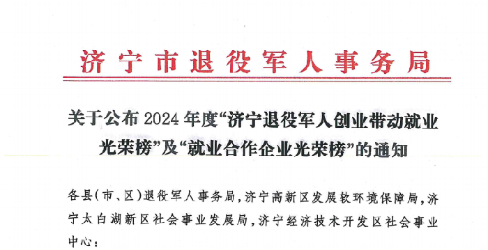 濟寧市退役軍人事務(wù)局公布2024年度“濟寧退役軍人創(chuàng)業(yè)帶動就業(yè)光榮榜”及“就業(yè)合作企業(yè)光榮榜”,其中,山東天意機械股份有限公司位列“濟寧退役軍人就業(yè)合作企業(yè)光榮榜”。