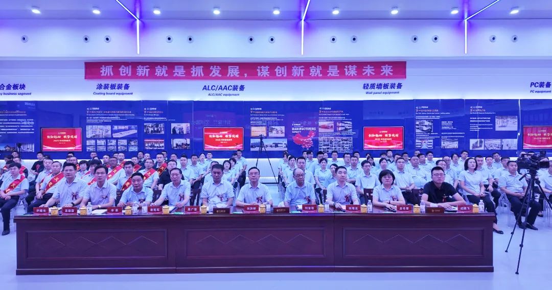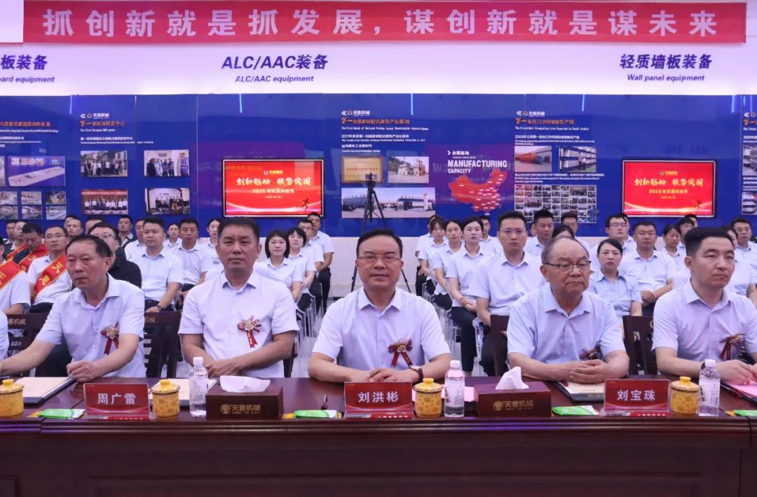最后,集團(tuán)董事長(zhǎng)劉洪彬做集團(tuán)總結(jié)及未來(lái)展望。劉總指出,天意上半年發(fā)展呈現(xiàn)三方面特點(diǎn),第一,創(chuàng)新驅(qū)動(dòng):以創(chuàng)新為市場(chǎng)回暖積蓄力量。上半年,研發(fā)了模塊智能化柔性生產(chǎn)線(xiàn),為模塊化房屋建造提供智能裝備,研發(fā)了光伏清掃機(jī)器人,提供光伏電站清潔解決方案。天意榮獲山東省五一勞動(dòng)獎(jiǎng)狀,入選山東省先進(jìn)級(jí)智能工廠、省級(jí)專(zhuān)家服務(wù)基地,卓越也建成了新的工業(yè)互聯(lián)網(wǎng)展廳。上半年,產(chǎn)學(xué)研合作邁出新步伐,天意與山東大學(xué)共同舉辦了“天意杯”山東大學(xué)第五屆智造未來(lái)創(chuàng)新大賽,山東交通學(xué)院黨委書(shū)記王偉一行、山東建筑大學(xué)校黨委常委、副校長(zhǎng)邱立平一行來(lái)集團(tuán)參觀座談,共謀發(fā)展新篇章。第二,國(guó)際市場(chǎng):用中國(guó)智造點(diǎn)亮"一帶一路"。上半年,天意參加了俄羅斯國(guó)際工程機(jī)械展、廣交會(huì)、德國(guó)寶馬展、漢諾威工業(yè)博覽會(huì)、沙特阿拉伯利雅得五大行業(yè)展覽會(huì)等重量級(jí)國(guó)際展會(huì)。塔吉克斯坦總統(tǒng)親臨考察的墻板項(xiàng)目,成為當(dāng)?shù)鼐G色建筑的示范工程。與俄羅斯客戶(hù)簽訂了ALC和PC大單。這些突破不僅帶來(lái)了42%的出口增長(zhǎng),更讓中國(guó)建材高端裝備贏得了世界尊重。第三,強(qiáng)勢(shì)突圍:三大引擎驅(qū)動(dòng)未來(lái)發(fā)展。在鞏固裝配式建筑裝備主業(yè)的同時(shí),培育了三大新增長(zhǎng)極,分別是光伏清掃機(jī)器人(已具備智能導(dǎo)航、自主清潔、高效節(jié)能等特點(diǎn))、智慧物流(目前已有京東、拼多多、好想來(lái)等大型企業(yè)入駐)、新能源業(yè)務(wù)板塊(天意已實(shí)現(xiàn)了80%的綠電生產(chǎn),正在搭建離網(wǎng)儲(chǔ)能系統(tǒng),未來(lái)還將建設(shè)微電網(wǎng)和虛擬電廠)。