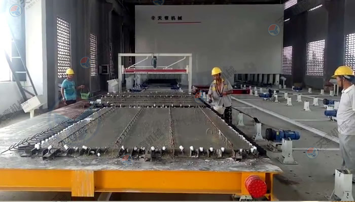疊合板/內(nèi)墻板生產(chǎn)線采用高精度、高結(jié)構(gòu)強(qiáng)度的成型模具,經(jīng)自動布料機(jī)把混凝土澆筑其中、振動臺振搗后并不立即脫模,而是經(jīng)預(yù)養(yǎng)護(hù)、蒸汽養(yǎng)護(hù),使構(gòu)件強(qiáng)度滿足設(shè)計(jì)強(qiáng)度時才進(jìn)行拆模處理,拆模后的成品構(gòu)件運(yùn)輸至成品暫存區(qū)或室外堆場,而空模臺沿輸送線自動返回,形成自動化環(huán)形流水作業(yè)。