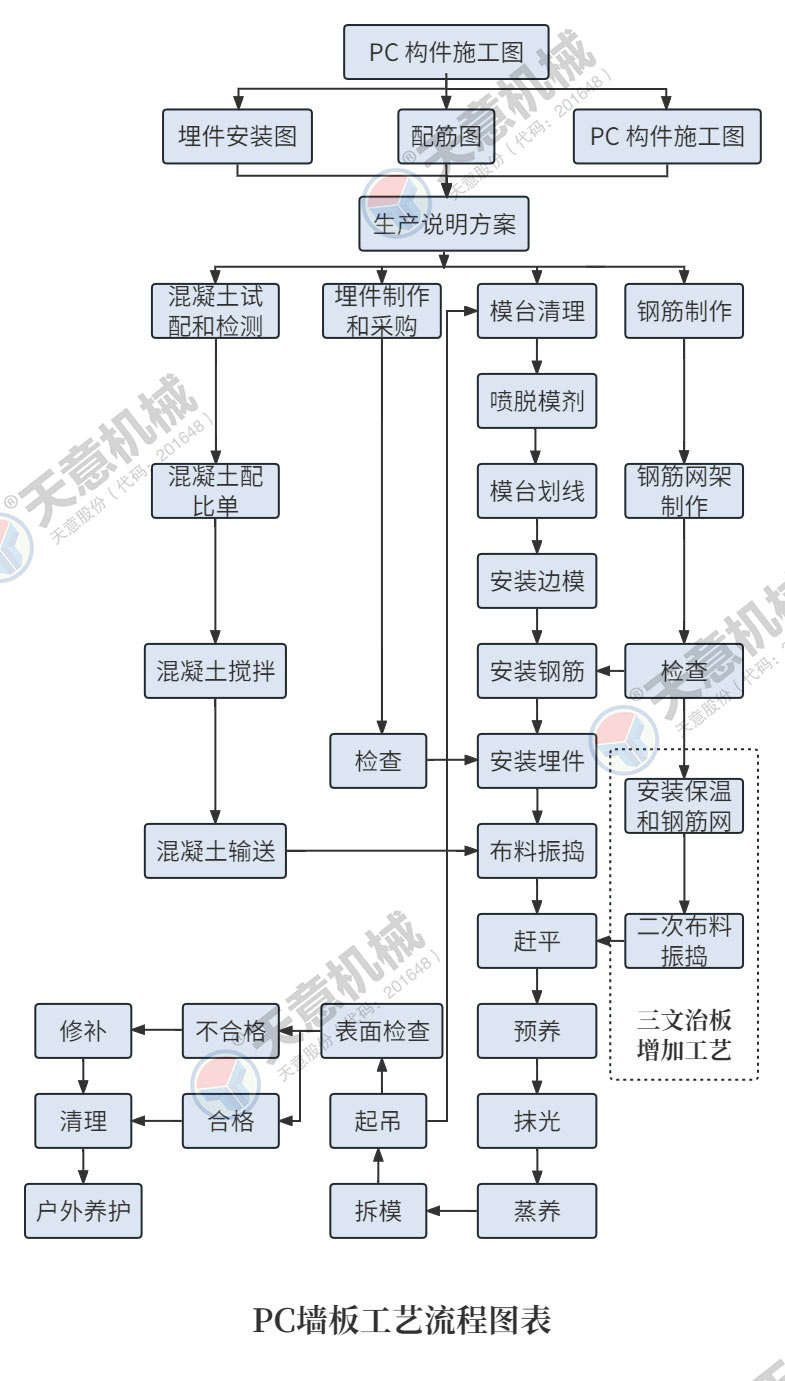 PC環(huán)形疊合板/內(nèi)墻板生產(chǎn)線的主要設(shè)備包括雙梁橋式起重機(jī)、清理機(jī)、脫模劑噴涂機(jī)、布料機(jī)、振動臺、趕平機(jī)、拉毛裝置、預(yù)養(yǎng)窯、抹光機(jī)、碼垛車、養(yǎng)護(hù)窯、翻轉(zhuǎn)機(jī)、擺渡車、支撐滾輪、驅(qū)動輪、模臺和成品運(yùn)輸車等。