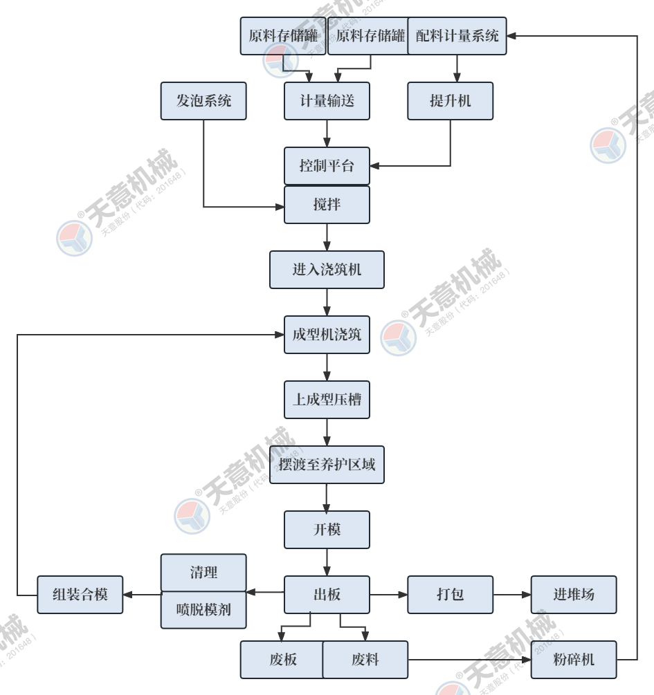 TYF-16A型復(fù)合墻板生產(chǎn)線是天意機(jī)械公司綜合國內(nèi)外技術(shù)經(jīng)驗,開發(fā)研制的新型墻體板材生產(chǎn)線。復(fù)合墻板生產(chǎn)線主要分為配料系統(tǒng)、攪拌系統(tǒng)、發(fā)泡系統(tǒng)、數(shù)控配電系統(tǒng)、墻板成型系統(tǒng)、料漿泵送系統(tǒng)、EPS預(yù)發(fā)系統(tǒng)、液壓循環(huán)系統(tǒng)、整體出板系統(tǒng)。